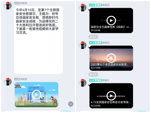 安全保卫处于4月15日在学校职工QQ群和学工管理QQ群推送了15个国家安全教育宣传视频,提高了广大职工安全防范的本领,把维护国家安全贯穿到日常的本职工作中;同时进一步加强了班主任、辅导员等学工队伍对万象城官网大学生的安全教育,实现安全教育横到边,纵到底,全员覆盖。