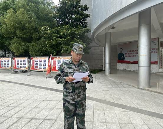 志愿服务团团长唐轶洁作表态发言。他表示,作为国防动员志愿服务团中的一员,要广法宣传国防知识,积极投身国防动员志愿服务当中,为国防事业贡献自己的一份力量。