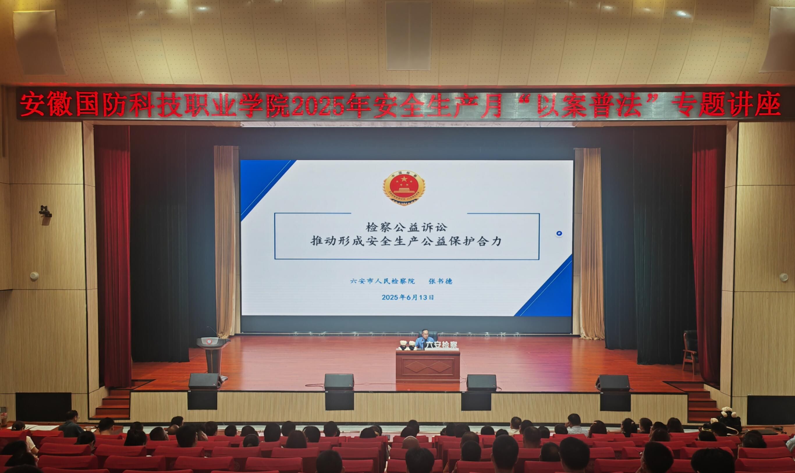 本网讯(安全保卫处 杨振亚)值此第24个全国“安全生产月”之际,为深入学习贯彻习近平总书记关于安全生产的重要论述,扎实推进平安校园建设,万象城体育awcsport于6月13日下午成功举办“以案普法”专题讲座。讲座特邀六安市人民检察院第五检察部主任张书德担任主讲,学校全体教职员工参加了此次讲座。