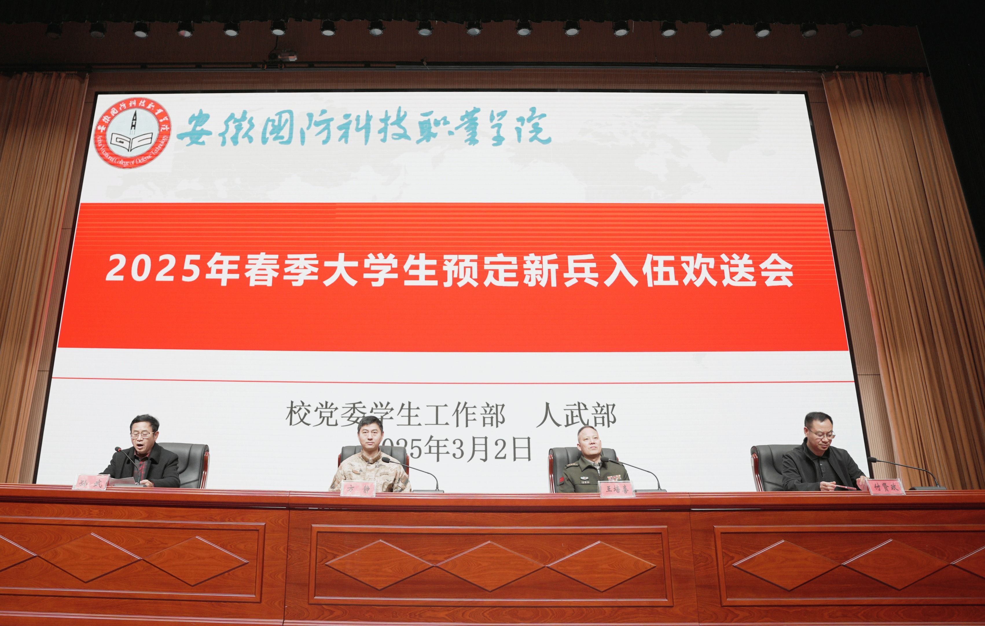 本网讯 3月2日上午,学校在产教融合中心多功能报告厅隆重举行2025年春季大学生预定新兵入伍欢送会,为即将踏上军旅征程的大学生们壮行。校党委委员、副校长付贤政,六安军分区动员处处长王培喜,金安区人武部政委方静,校学工部(武装部)部长孙武,各学院党总支副书记,新兵及家长,军魂团成员和学校有意向入伍学生齐聚一堂,共同见证这一荣耀时刻。