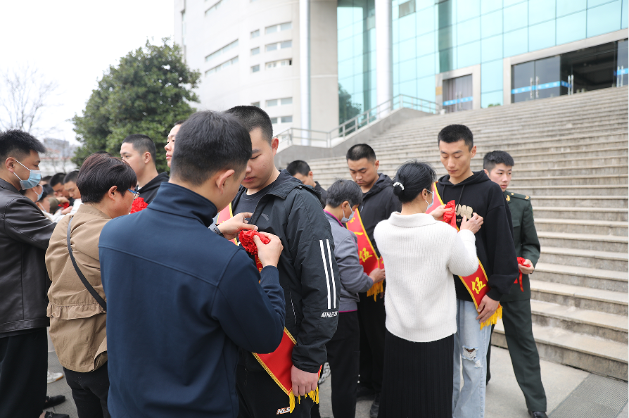 仪式后,家长们为即将踏上军旅之路的新兵们戴红花、披绶带,与会领导同新兵们合影留念并前往国防教育体验馆参观。
