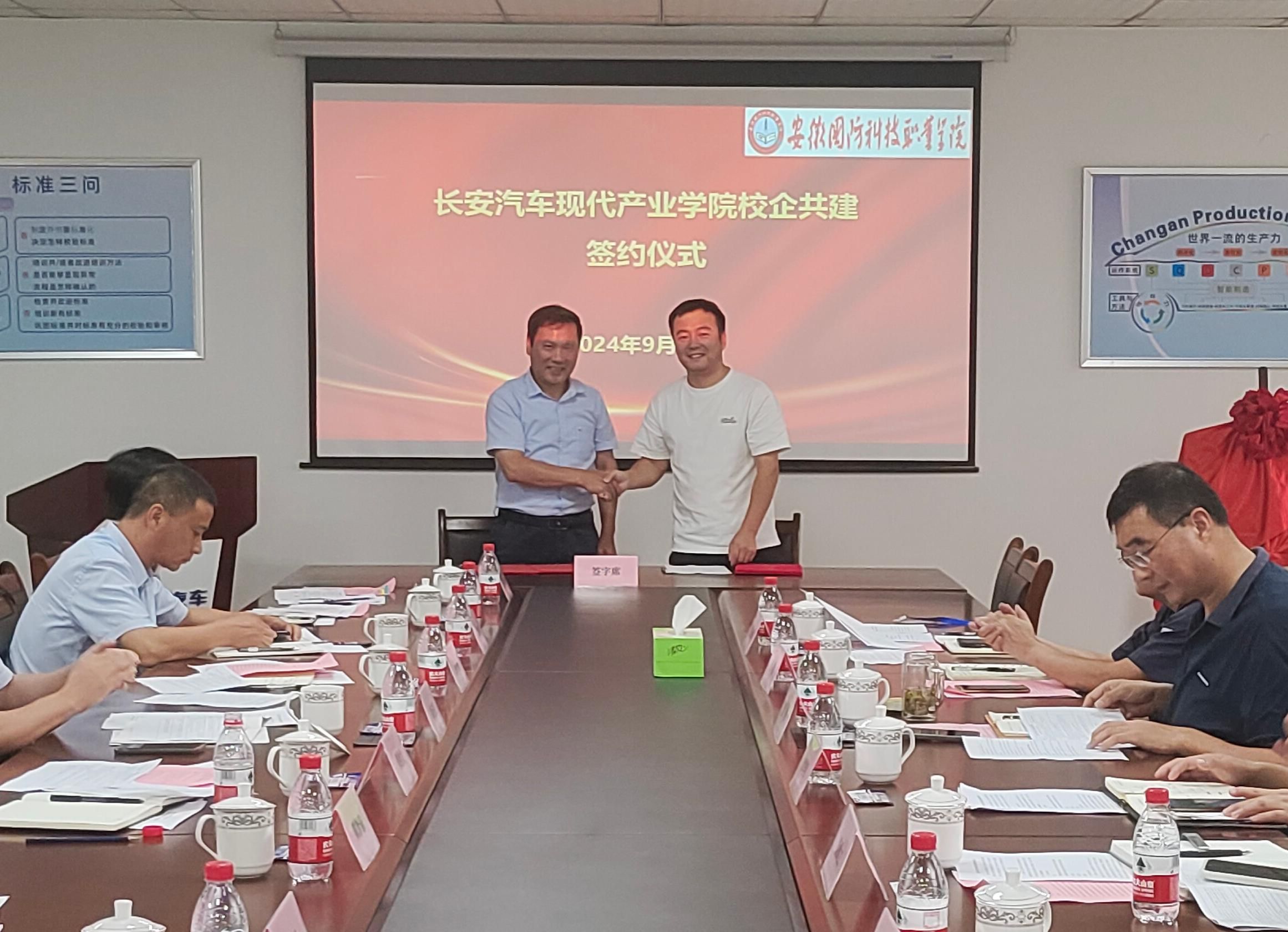 随后,学校分别与产业学院共建企业合肥长安汽车有限公司、合肥至信机械制造有限公司、安徽强龙工业有限公司签订了《长安汽车现代产业学院校企共建合作办学协议》,徐正红与徐耀共同为产业学院揭牌。