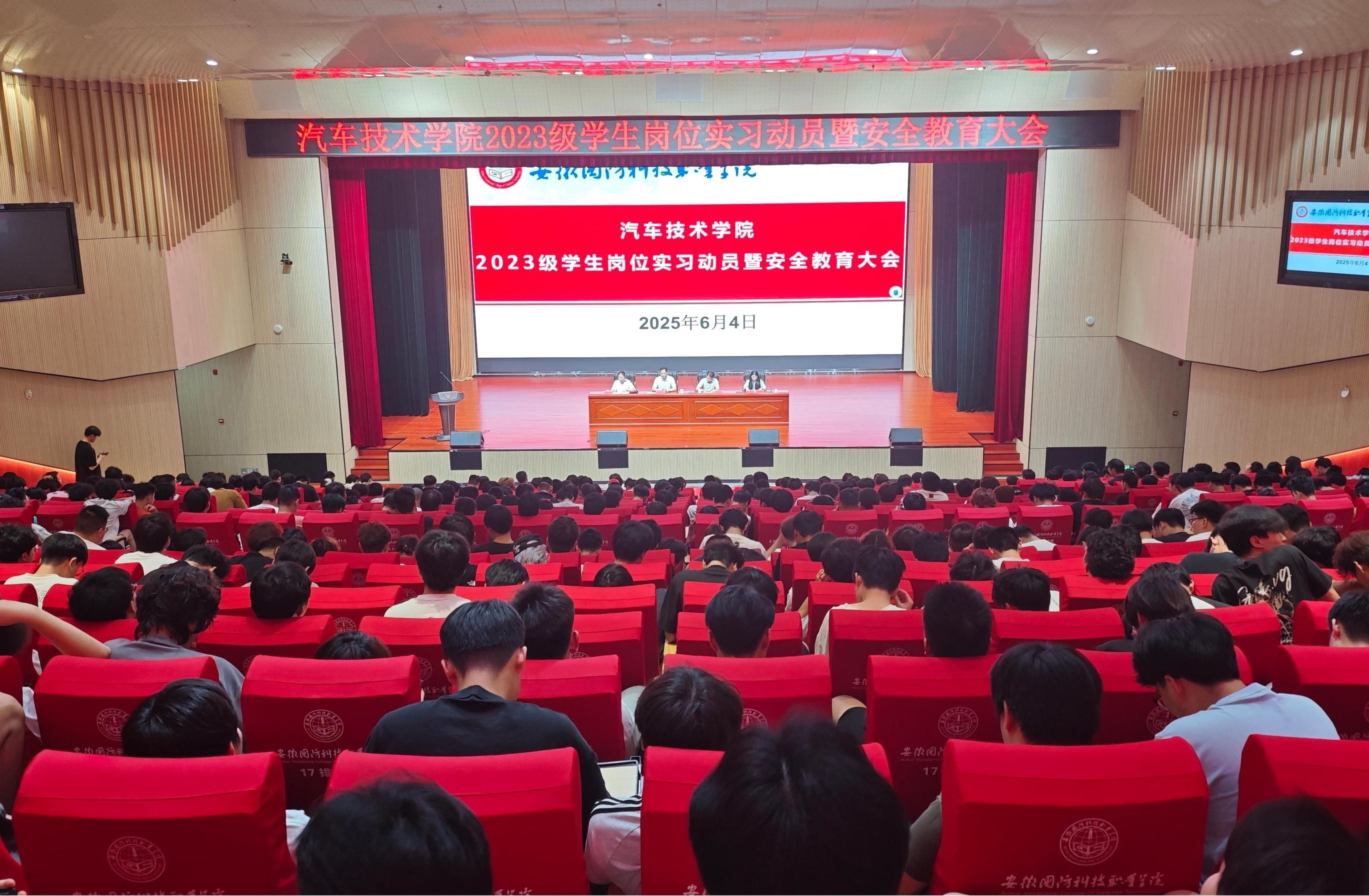 本网讯(汽车技术学院 张洋洋)为扎实推进2025年学生岗位实习工作,加强实习教学管理,6月4日晚,汽车技术学院在产教融合中心报告厅举办2023级学生岗位实习动员暨安全教育大会,帮助同学明确实习方向,为即将到来的岗位实习做好充分的准备。汽车技术学院党政班子成员、企业代表、2023级各班辅导员以及岗位实习指导教师参加大会。