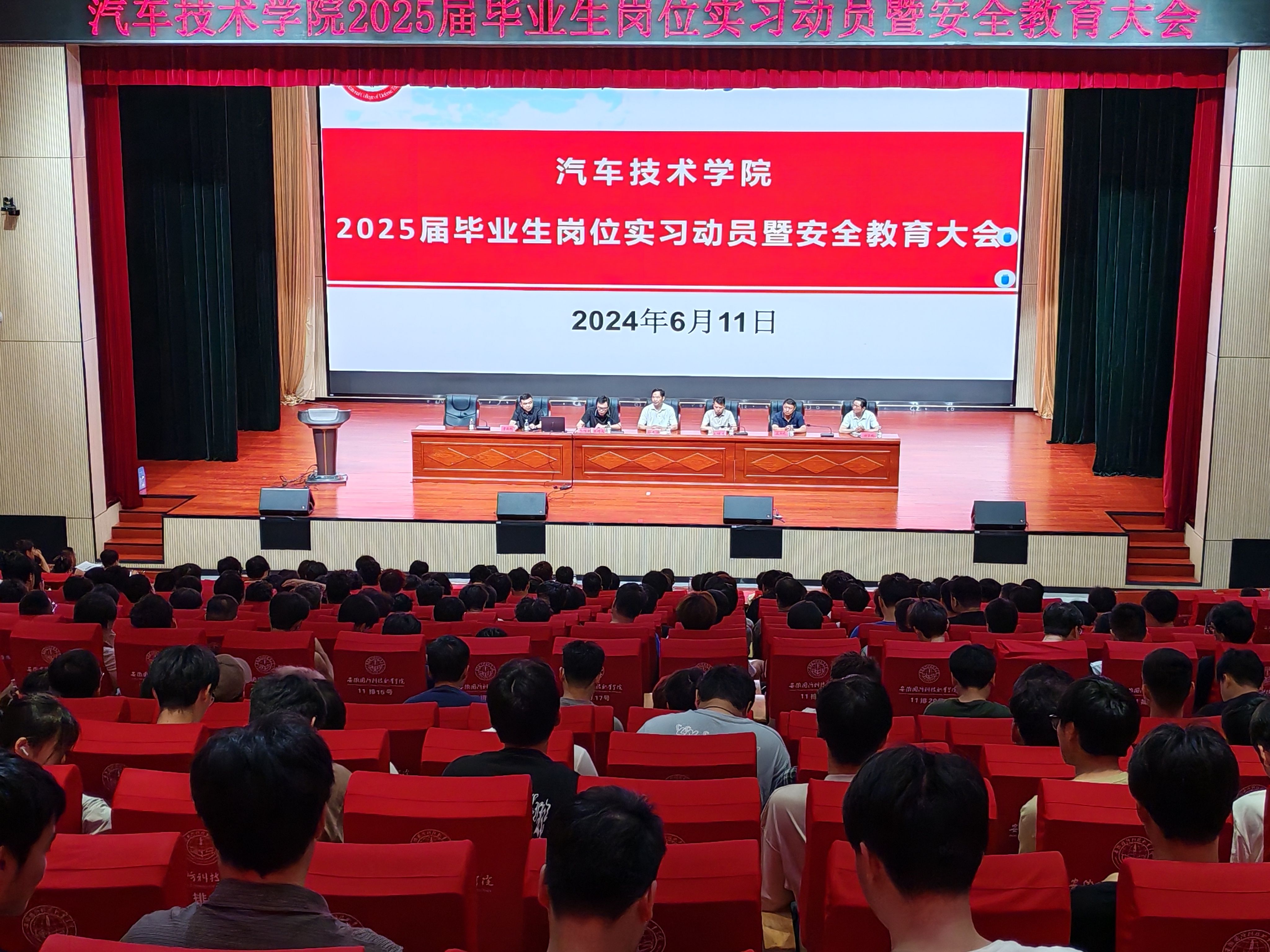 本网讯(汽车技术学院 黄世超)为顺利开展2025届毕业生岗位实习工作,确保实习质量、加强实习教学管理,根据专业人才培养方案规定,6月11日晚,汽车技术学院在产教融合中心报告厅举办2025届毕业生岗位实习动员暨安全教育大会。学院党总支书记孙良平、学院副院长(主持工作)姜继文、党总支副书记余桂刚、全体毕业班辅导员以及两家企业代表出席本次会议,会议由余桂刚主持。