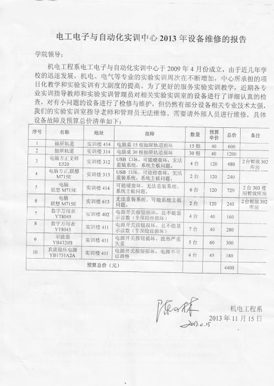 机电工程系电工电子与自动化实训中心于2009年4月份成立,由于近几年学校的迅速发展,电气、机电、电子等专业的实验实训周次在不断增加,中心所承担的项目化教学和实验实训有大副度的提高。为了更好的服务实验实训教学,近期各专业实训指导教师和实验实训管理员对相关实验实训室的设备进行了详细认真的检查,对有小问题的设备进行了检修与维护,但仍然有部分设备相关专业技术太强,特申请外部相关技术人员进行维修。(供稿:吴年祥)
