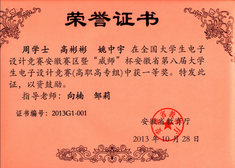 2013 年全国大学生电子设计竞赛暨“威师”杯安徽省第八届大学生电子设计竞赛于9月初落下帷幕。在认真总结去年所获成绩的基础上,我院年轻老师积极备赛,认真指导,经过初赛和最后的综合测试,我院机电工程系参赛代表队中,高彬彬、姚中宇、周学士3位同学获得高职高专组一等奖,向雷、胡斐斐、周洋3位同学获得高职高专组二等奖。