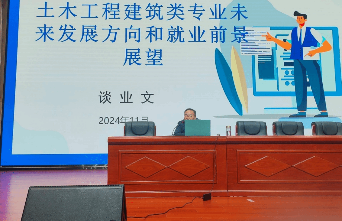 本网讯(城市建设学院 高烨)为帮助学生明确土木工程建筑类专业的学习重点与发展路径,了解行业前沿动态及就业前景,城市建设学院于2024年11月20日下午在产教融合中心多功能报告厅成功举办了《土木工程建筑类专业未来发展方向和就业前景展望》的专题讲座。活动特邀建筑行业资深专家、国家一级注册造价师、一级注册建造师、注册监理工程师、主持国际项目管理协会认证的项目管理专家谈业文担任主讲。城市建设学院专业教师和学生参加了此次活动,活动由城市建设学院院长王红林主持。