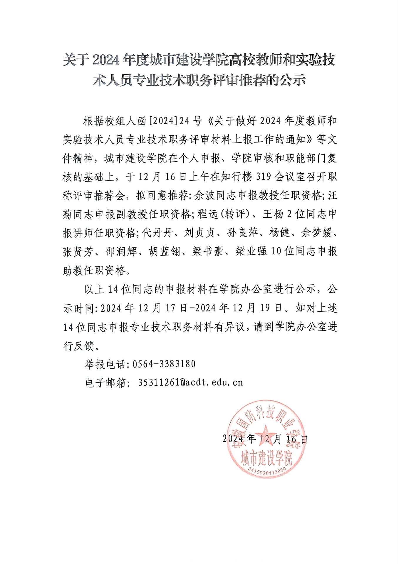 关于2024年度城市建设学院高校教师和实验技术人员专业技术职务评审推荐的公示