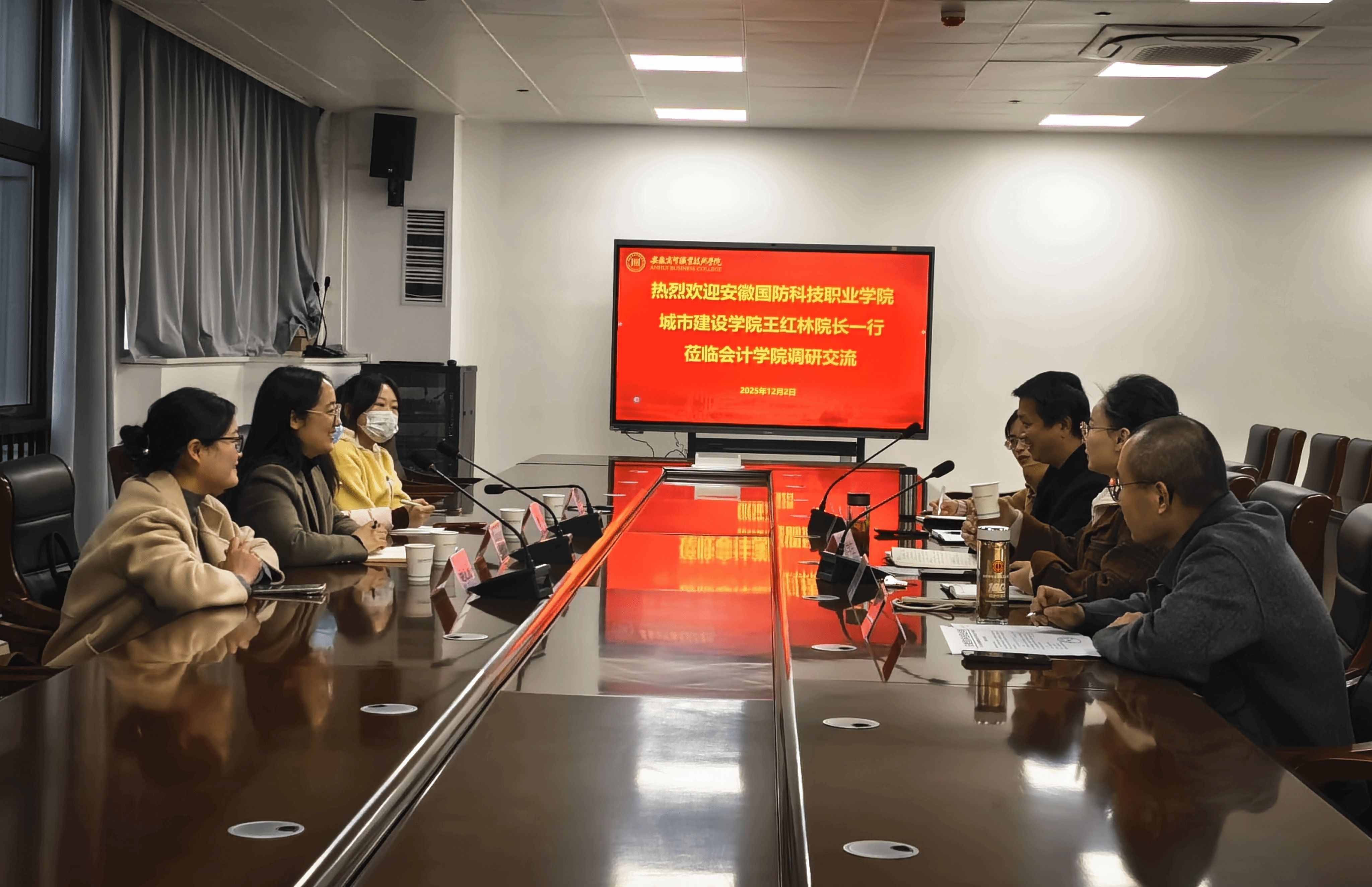 本网讯(城市建设学院 赵之元)为进一步优化专业建设布局、创新人才培养模式、提升大数据与会计专业办学质量,12月2日下午,城市建设学院院长王红林带领会计教研室主任赵之元及骨干教师一行4人,赴安徽商贸职业技术学院会计学院开展专题调研,会计学院院长鲁学生、副院长苏任刚及相关教研室负责人热情接待了调研团队,双方围绕调研主题进行了深度交流。