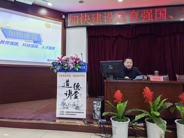 本网讯(城市建设学院 王俊)为深入贯彻落实党的二十大精神,深入贯彻落实党中央决策部署,推动“时代新人铸魂工程”实施,落实《中共安徽省委教育工作领导小组秘书组 中共安徽省委教育工委关于进一步推进领导干部上讲台开展思想政治教育工作的通知》(皖教工委函[2023]442号)文件要求,推动习近平新时代中国特色社会主义思想“三进”工作落实落细,12月27日,在图书馆报告厅,校纪委书记丁守宝为城市建设学院、经贸管理学院师生代表做形势与政策专题报告。报告由城市建设学院党总支书记张宗江主持。