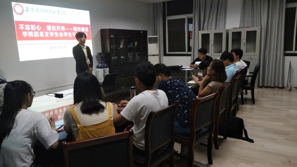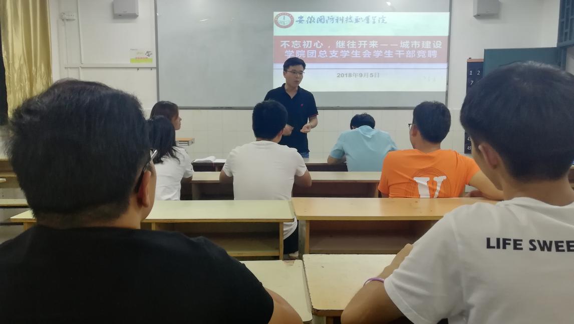 2018年9月5、6日,城市建设学院团总支学生会换届竞选大会在二号教学楼201教室顺利召开。院团总支书记张凤,辅导员袁野、罗承筠、康垚以及所有主席团成员出席了本次大会。