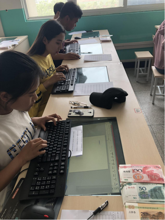 本次比赛分为三个环节组成。第一环节“点钞技能”,参赛选手在规定的时间内完成桌面点钞券的清点工作,并写好清点结果。比赛场上,各位选手指法灵活、动作流利,充分体现了点钞技能。接下来进行的是“字符录入”环节,这一环节是考验同学们的打字熟练程度,此环节同学们的表现积极,认真应对,赛出了国防的风采。最后一个环节即“金融理论知识”,以题目的形式考查同学们的基础知识,此环节同学们得分不分上下,势均力敌。整个赛场从始至终都被紧张激烈而又活跃积极的氛围所围绕着。