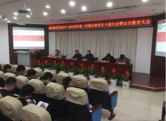3月21日下午,城市建设学院在图书馆报告厅召开2017-2018学年第二学期全体学生干部大会和安全教育大会。总结上学期学院工作,布置本学期及近期工作任务,加强校园安全和校风校纪教育。城市建设学院长张显国,党总支副书记叶启衡,团总支书记张凤,辅导员袁野和罗丞筠,以及团总支学生会、院属专业社团、班级全体学生干部参加了大会。