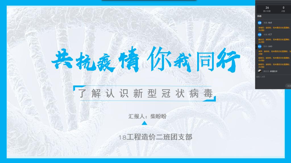 为深入贯彻落实习总书记关于新型冠状病毒感染的肺炎疫情防控工作的重要指示精神,更好地落实学校和校团委疫情防控工作部署和要求,将疫情防控与学生思想政治教育有机结合。4月10日—22日,城市建设学院以班级团支部为单位,依托QQ群、微信群、钉钉等各类新媒体平台,以语音、视频等形式集中召开以“共战疫情·你我同行”为主题的线上主题团日活动。