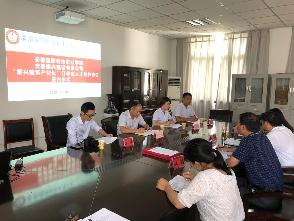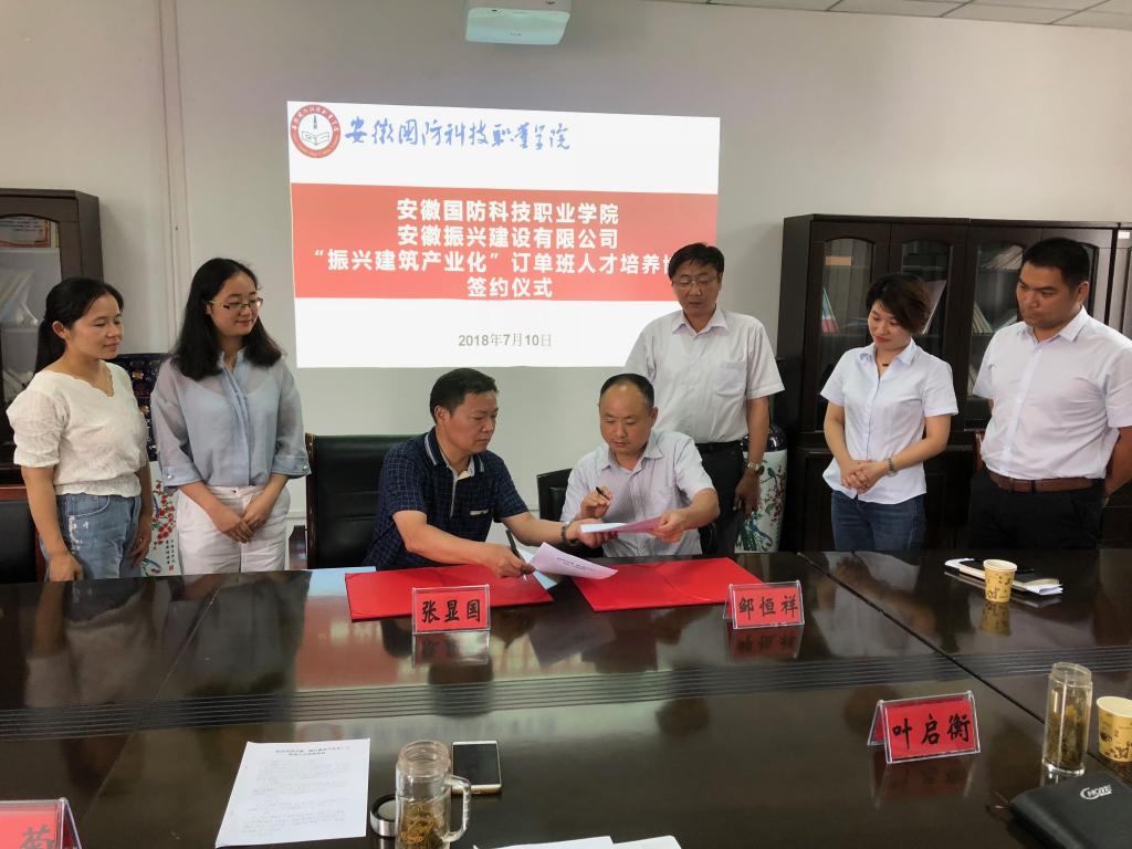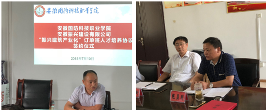 为落实“培养具有创新精神和实践能力的应用型人才”的办学理念, 城市建设学院积极探索校企合作的人才培养模式,经过与安徽振兴建设有限公司深入研讨,开展订单人才培养模式的研究和实践,2018年7月10日下午, “振兴建筑产业化”订单班人才培养协议签约仪式在城市建设学院会议室正式举行。