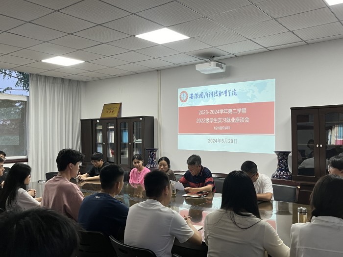 本网讯(城市建设学院 王俊)5月20日晚,城市建设学院党总支书记张宗江主持召开实习就业座谈会,2022级各班学生代表参会。