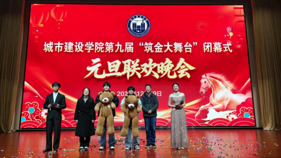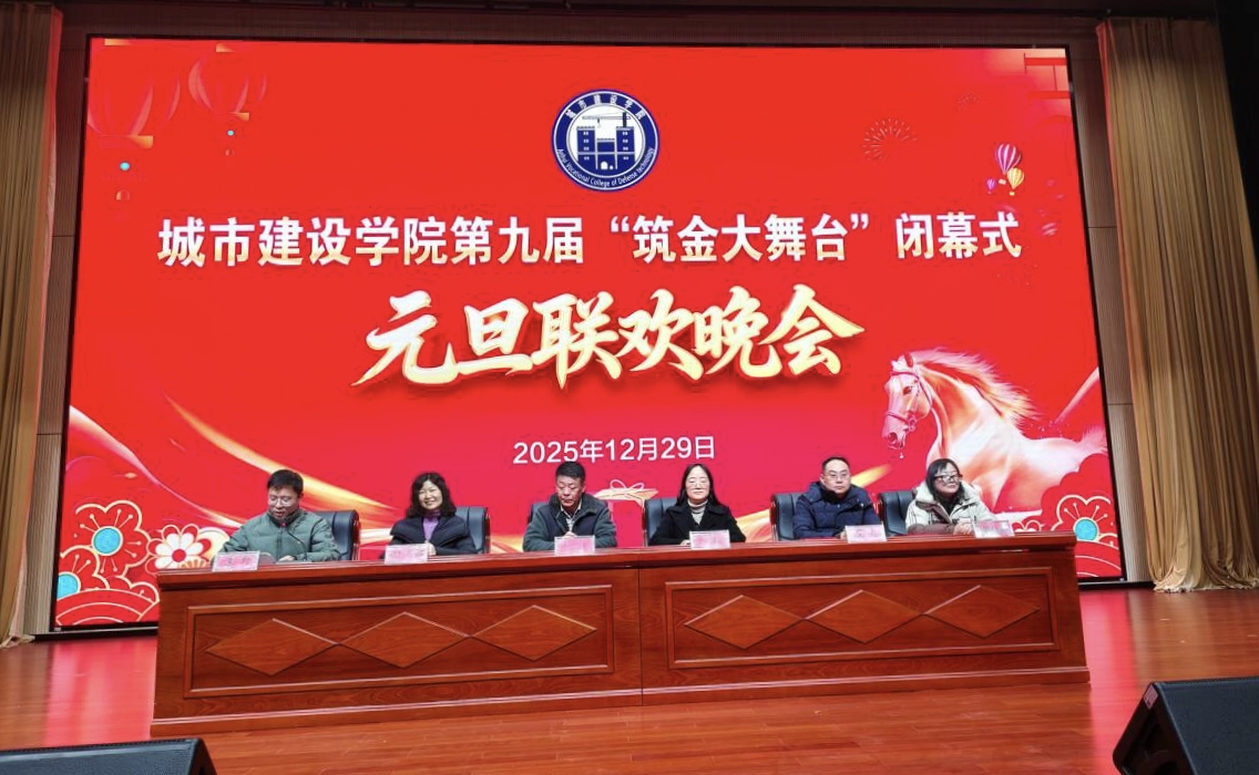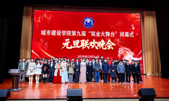 本网讯(城市建设学院 袁野)2025年12月29日晚,城市建设学院第九届“筑金大舞台”闭幕式暨元旦联欢晚会在产教报告厅隆重举行。学院班子成员、各教研室教师代表、协会指导老师、专兼职辅导员以及24、25级学生代表欢聚一堂,共话成果、喜迎元旦。