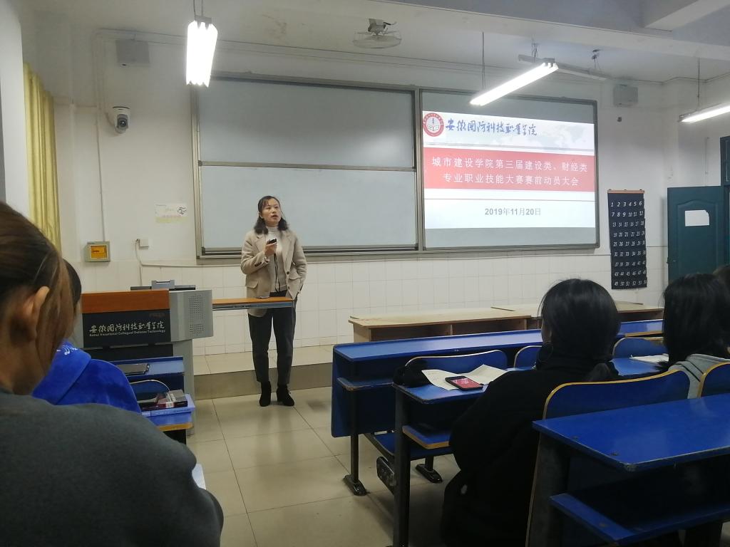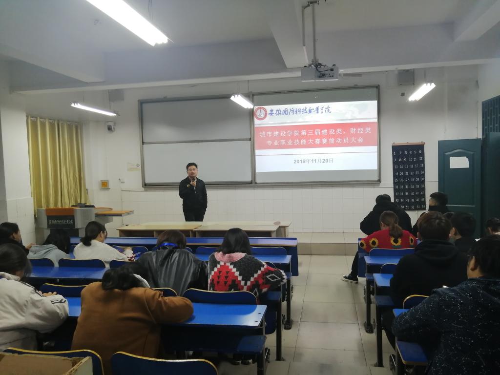 (城市建设学院 张凤)为充分做好2020年万象城体育awcsport建设类、财经类专业职业技能大赛的备战工作,推进城市建设学院第三届“筑金大舞台”——筑金赛场活动建设,城市建设学院于11月20日晚上5点30分在教2楼105开展职业技能大赛赛前动员大会。会议由城市建设学院团总支书记张凤主持,会计协会指导教师赵之元、建筑工程协会指导教师胡仕婷、建设工程管理专业负责人汪菊、专业老师程磊、程远以及我院18、19级学生参加了本次会议。
