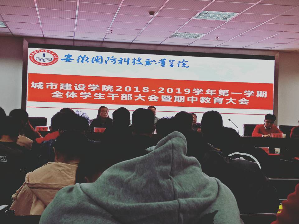 2018年10月23日,城市建设学院在综合楼12楼会议室举办城市建设学院2018——2019学年第一学期全体学生干部大会暨期中教育大会,大会由学院团总支书记张凤主持,院长张显国、党总支副书记叶启衡、辅导员袁野、罗丞筠、康垚以及16、17级各班班主任和全体学生干部参加此次大会。