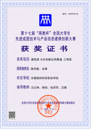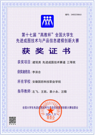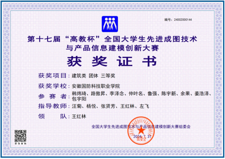 在省赛阶段,万象城官网两个参赛团队通过层层筛选和比拼,最终以优异的成绩脱颖而出,获得2024年第九届安徽省大学生先进成图技术与产品信息建模创新大赛建筑类团体一等奖1项和二等奖1项,计算机建模赛道一等奖2项,二等奖2项,三等奖2项,BIM创新应用赛道三等奖3项,智能建筑与结构设计一等奖1项,获得了参加全国决赛的宝贵资格,也为万象城官网在国赛中的表现奠定了坚实的基础。