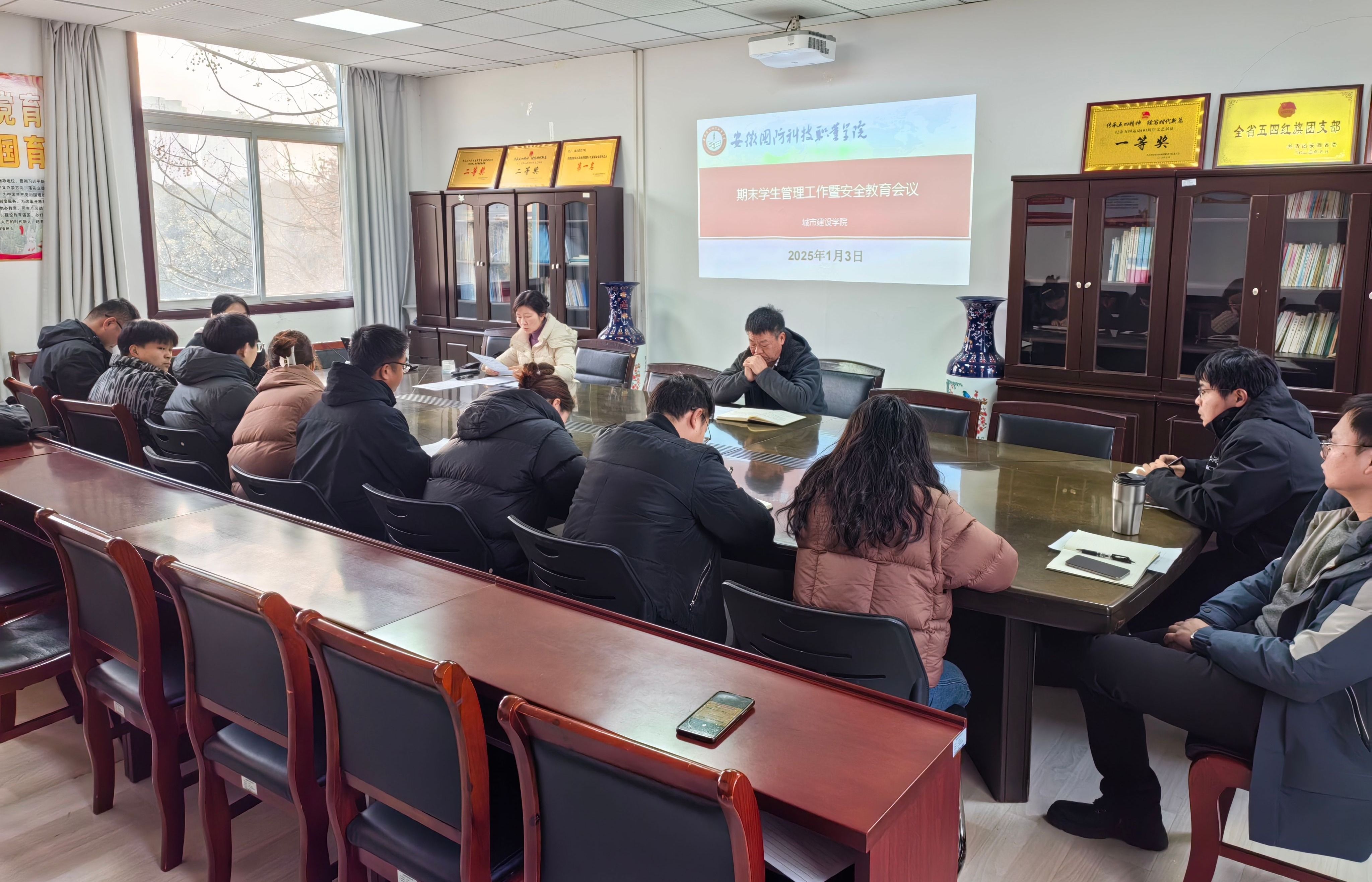 本网讯(城市建设学院 王俊)1月3日下午,城市建设学院在知行楼319会议室召开期末学生管理暨安全教育会议,学院党总支书记张宗江、副书记叶高洁和全体专兼职辅导员参加了会议。