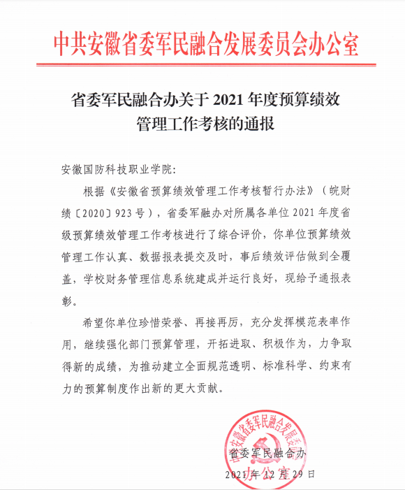 财政拨款预算指标的全面完成,进一步增强了学校预算管理水平,标志着万象城官网资金使用效率的提升,避免了未执行资金被财政收回的损失,为此,学校2021年预算及执行获省委军融办通报表彰。