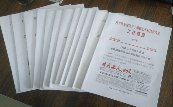 学校将学习好、宣传好、贯彻好党和国家的扶贫惠农政策作为一项重要工作,驻村扶贫宣传工作成绩显著。全年编发驻村扶贫《工作简报》12期,围绕脱贫攻坚、乡村振兴、党建工作、“两学一做”工作等制作各类专题8个,中央人民广播电台、安徽广播电视台、六安电视台、《安徽工人日报》、安徽教育网、皖工网等主流媒体报道学校扶贫工作20多次。学校《多措并举 精准帮扶 坚决打赢脱贫攻坚战》入选“全国职业院校精准扶贫典型经验集。《图说扶贫——学校扶贫工作一周年回顾》《脚下沾有多少泥土,心中积淀多少真情——学校驻村扶贫工作纪实》被全国职业院校精准扶贫协作联盟作为2018年全国扶贫日典型案例,学校扶贫工作获全国职业院校和社会各界纷纷点赞。