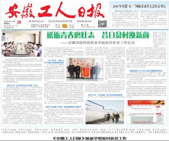 《安徽工人日报》在头版报眼位置报道了学校扶贫工作队荣获