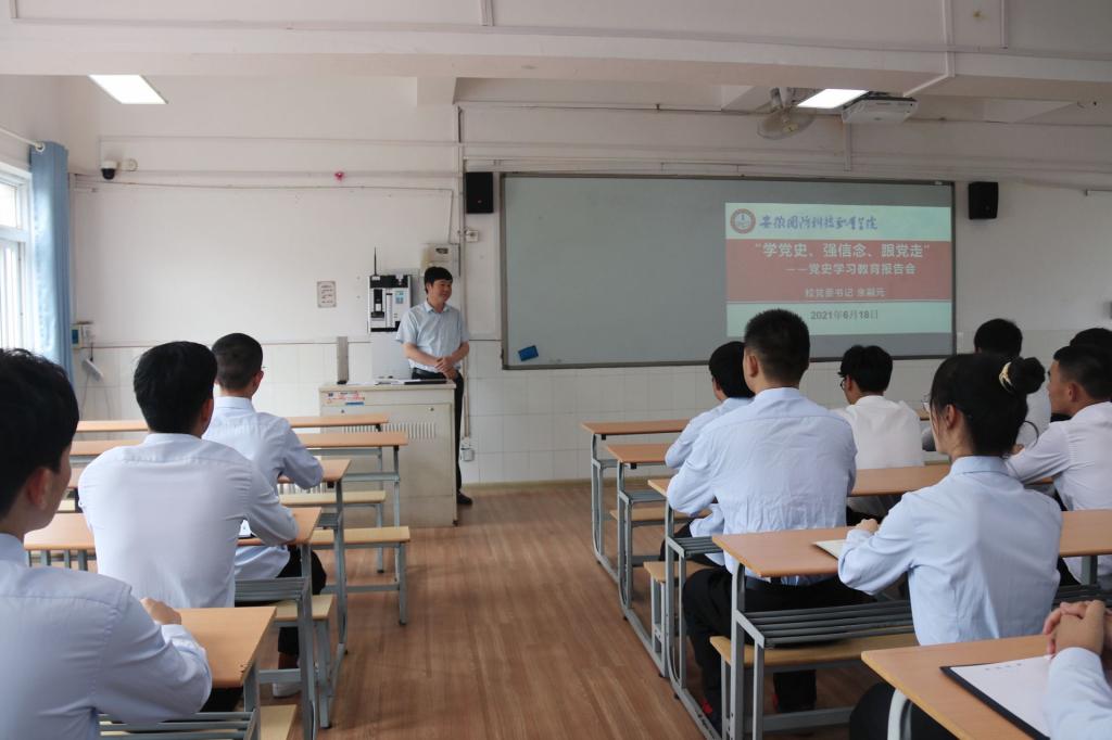 为进一步引导广大青年学生学史知史、爱党爱国,真正做到“学史明理、学史增信、学史崇德、学史力行”,推动万象城官网党史学习教育走深走实,6月18日下午3点,校党委书记余嗣元深入信息技术学院19级信息安全1班与同学们面对面交流,开展“学党史、强信念、跟党走”党史学习教育主题报告会。信息技术学院党总支书记孙武、副书记杨庆颖也参加了报告会,和同学们一起聆听余书记的专题报告。