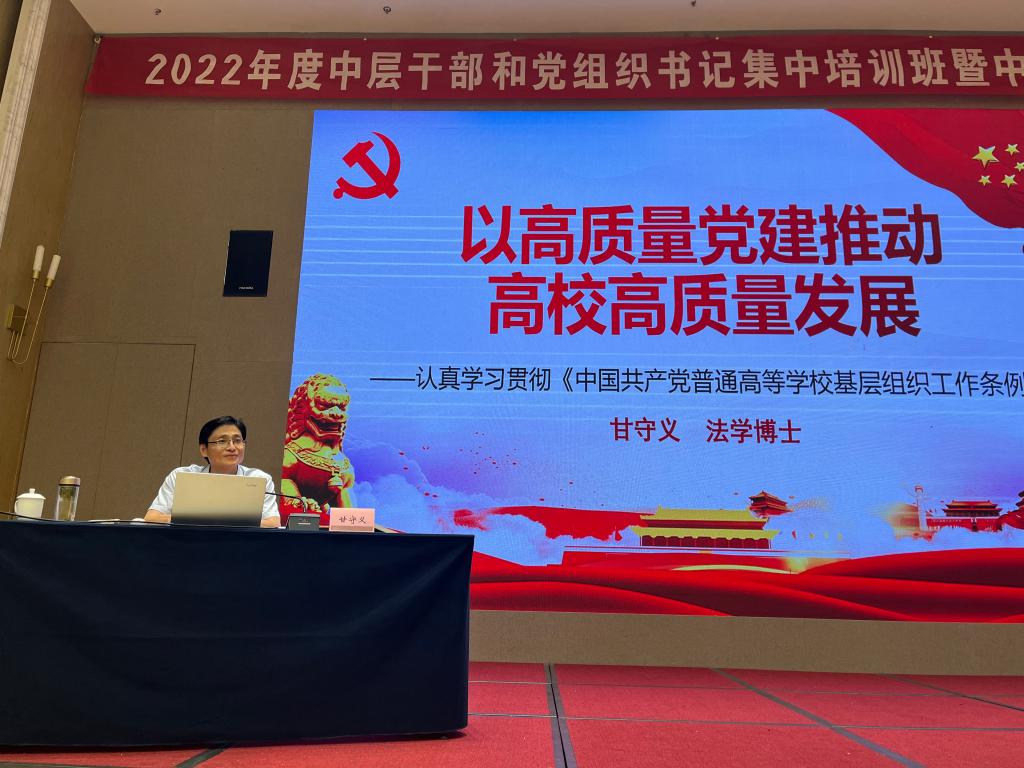 中共安徽省委党校(安徽行政学院)党的建设教研部、省委党校党内法规研究中心办公室副主任甘守义博士作《以高质量党建推动高校高质量发展—认真学习贯彻<中国共产党普通高等学校基层组织工作条例>》专题报告,从党内法规的发展、制定讲起,并重点解读了《中国共产党普通高等学校基层组织工作条例》,为今后学校基层党建质效提升具有很强的指导作用。