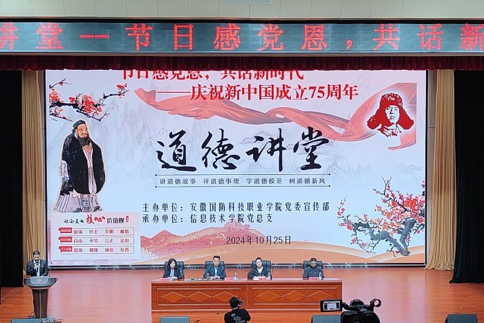 (信息技术学院 马士君)为热烈庆祝中华人民共和国成立75周年,持续深入学习贯彻习近平新时代中国特色社会主义思想和党的二十届三中全会精神,积极培育和践行社会主义核心价值观,10月25日下午,由校党委宣传部主办、信息技术学院党总支承办的以“节日感党恩,共话新时代——庆祝新中国成立75周年”为主题的道德讲堂活动在产教融合中心报告厅顺利举办。校党委委员、宣传(统战)部部长、马克思主义学院院长陈思,城市建设学院党总支副书记叶高洁,信息技术学院副院长雷惊鹏,各二级学院师生代表参加了此次活动。活动由信息技术学院党总支副书记杜洪宇主持。