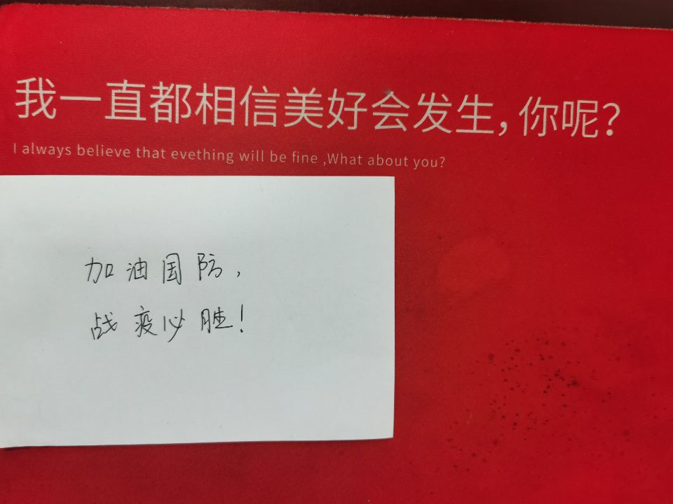 另外电气技术学院收到一份特殊的包裹,是由电气技术学院毕业生匿名捐赠口罩680只为母校加油,包裹上“加油国防,战疫必胜”的话语也给电气学院全体师生提供了更大的工作动力。