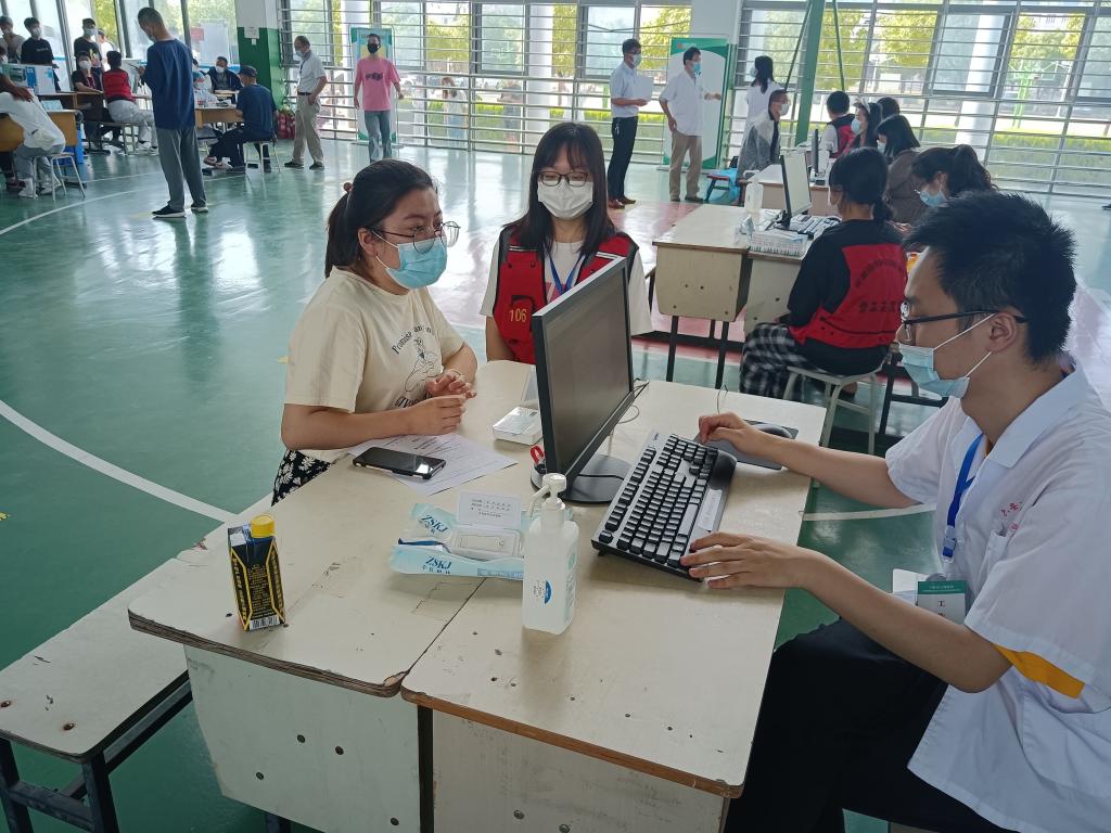 体育馆内,不管是在进口还是出口,登记、接种、留观等不同区域都有身穿红马甲志愿者们的身影,他们协助医护人员引导前来接种的师生按照接种点标识有序排队,保持安全距离。红马甲们一站就是一天,一个手势的指引,一个及时的提醒,一个暖心的帮助,让接种现场井然有序。