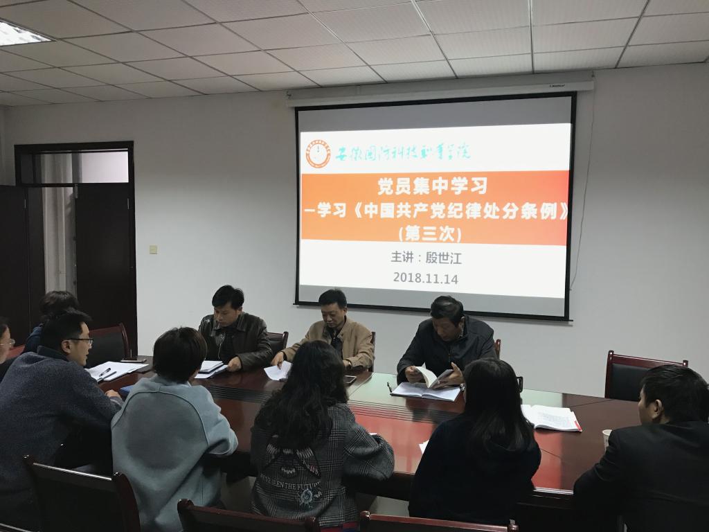 为更好地学习宣传、贯彻执行新修订的《中国共产党纪律处分条例》,增强广大教职工党员对新《条例》的认识。按照学校纪委和纪检监察室专题会议的要求,11月14日下午,汽车技术学院党总支开展专题学习教育活动,继续学习2018年新修订的《中国共产党纪律处分条例》,全体党员同志按时参加,会议由余桂刚副书记主持。