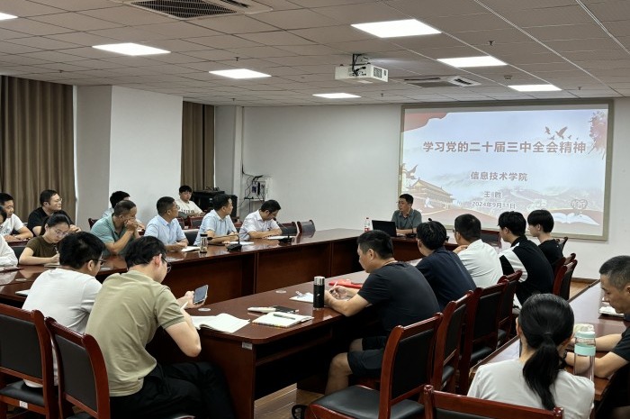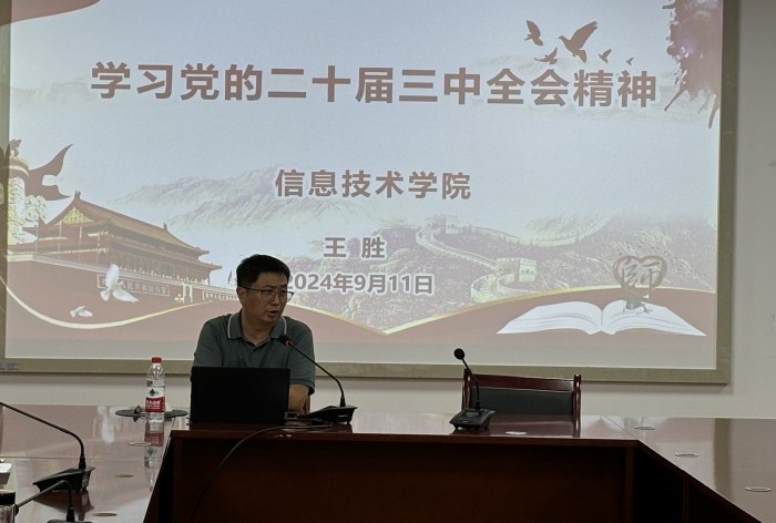 (信息技术学院 马士君)为深入学习贯彻落实党的二十届三中全会精神,推进学院教育教学工作高质量发展。9月11日下午,在秉心楼902会议室,学院党总支书记王胜为全体党员同志讲授题为《学习党的二十届三中全会精神》的专题党课。学院领导班子及全体教师党员、学生党员50余人参加了会议。
