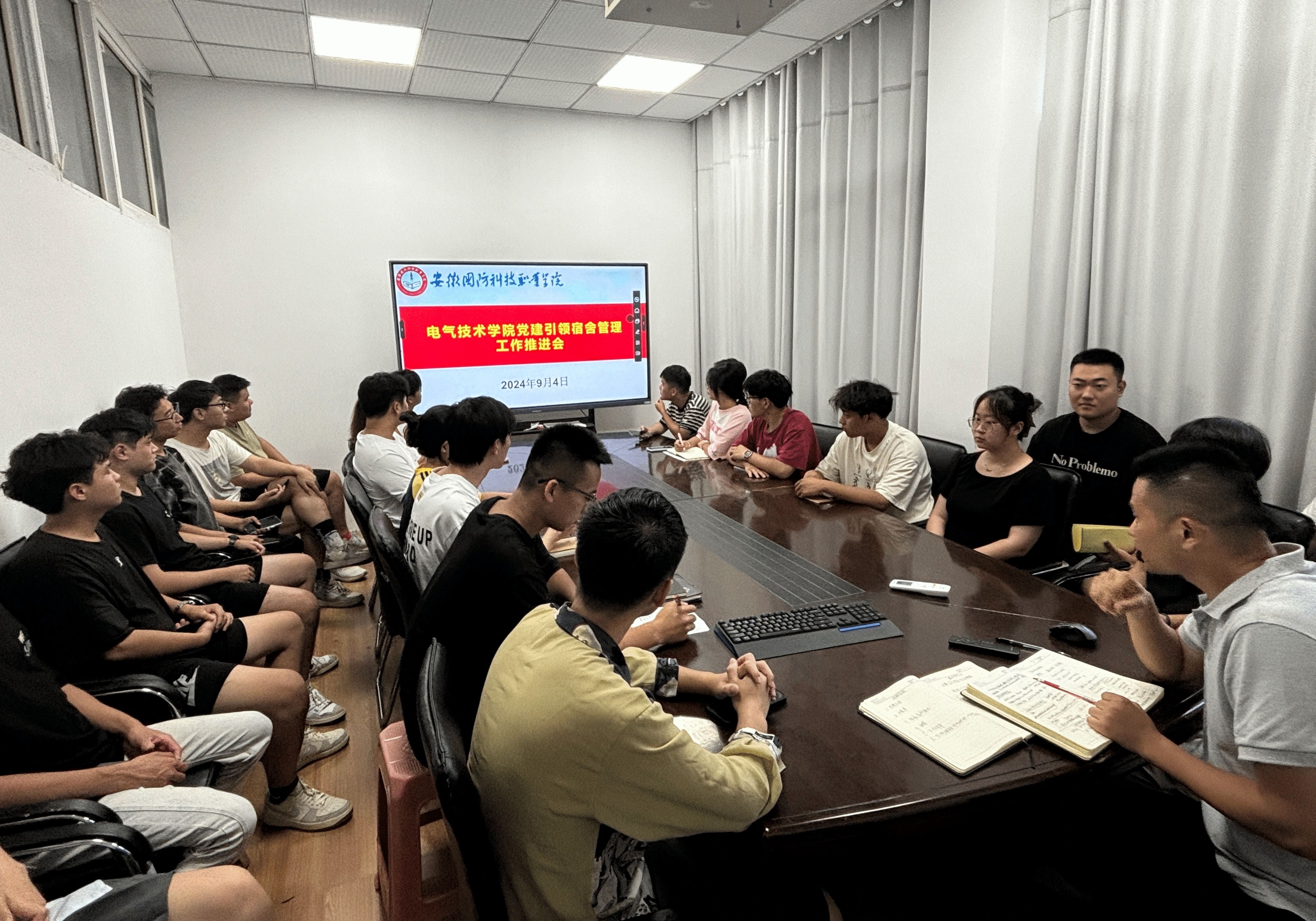 (电气技术学院 申晓伟)为深入学习贯彻党的二十届三中全会精神,落实立德树人根本任务,充分发挥党员教师在学生成长中的引领作用,坚持以党建为引领,以创建“安全、健康、文明、和谐、整洁”的宿舍为目标,确保宿舍和谐安全稳定,9月4日晚,电气技术学院召开了党建引领宿舍管理工作推进会。