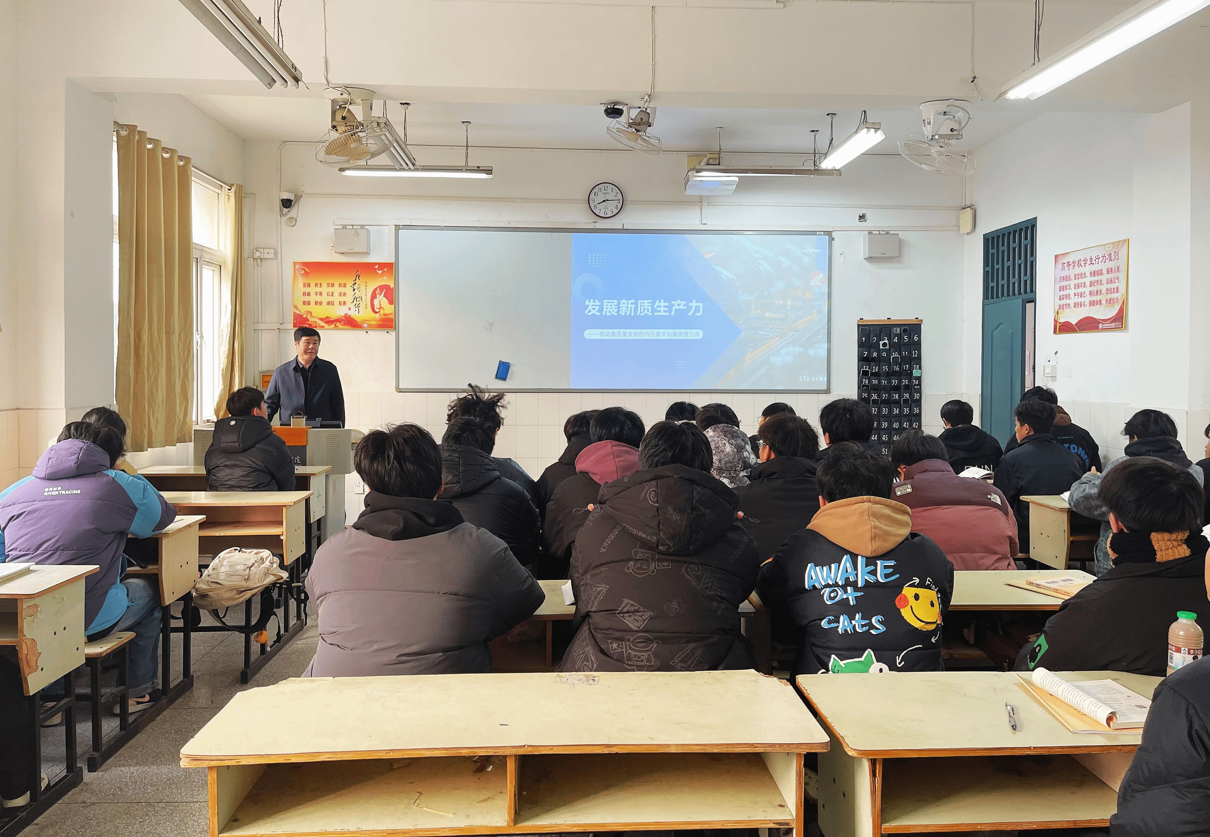 在授课过程中,余嗣元强调,要充分认识到发展新质生产力是推动高质量发展的内在要求和重要着力点。他鼓励同学们要紧跟时代步伐,坚持理论与实践相结合,从课堂中汲取知识,以“学”促“质”,勇于创新,以“新”促“质”,投身实践,以“智”促“质”,到实践中去应用,掌握一技之长,带着专长走上工作岗位,不断拓宽视野,积极学习新知识、新技术,努力成为适应新时代要求的高素质技术技能人才。