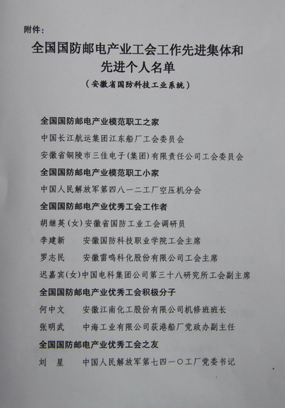 2011年12月,中国国防邮电工会全国委员会下发文件,决定授予王广健等320名同志全国国防邮电产业“优秀工会工作者”荣誉称号,我院党委委员、工会主席李建新同志荣获这一荣誉。