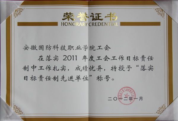 在日前召开的2012年度省国防工业工会工作会议上,省国防工业工会表彰了2011年度直属企事业工会落实工作目标责任制先进单位。我院工会被授予落实2011年度工会工作目标责任制先进单位称号。这是自2004省国防工会对我院工会实行工作目标责任制管理以来,我院工会连续第8 年获得这一荣誉称号。