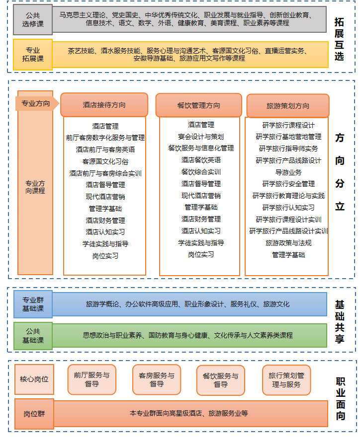 本专业培养能够践行社会主义核心价值观,传承技能文明,德智体美劳全面发展,具有一定的科学文化水平,良好的人文素养、科学素养、数字素养、职业道德、创新意识,爱岗敬业的职业精神和精益求精的工匠精神,较强的就业创业能力和可持续发展的能力,掌握本专业知识和技术技能,具备数字化思维和技术应用能力,具备职业综合素质和行动能力,面向住宿业、餐饮业行业的旅店服务员、茶艺师、宴会定制服务师、其他住宿和餐饮服务人员等岗位群,能够从事酒店、餐饮民宿、邮轮以及其他住宿新业态和高端接待业的服务、数字化运营与管理工作的高技能人才。