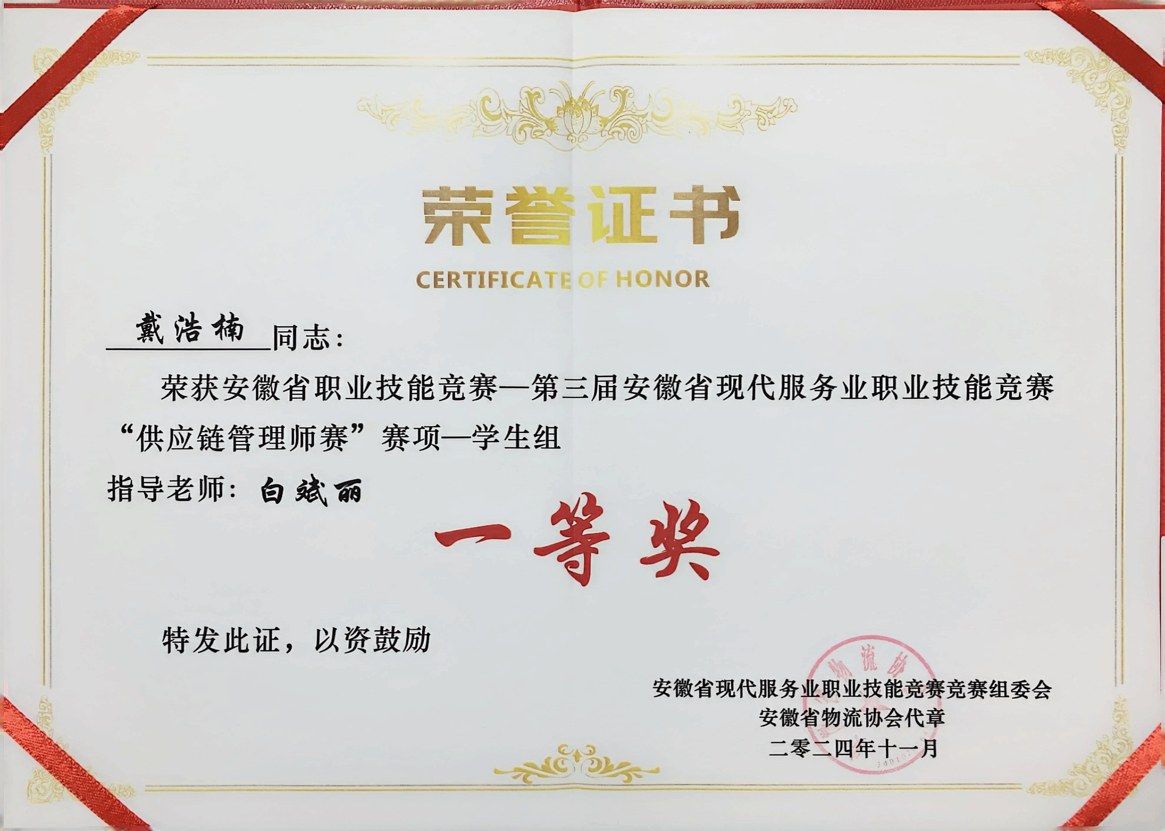 11 | 安徽省职业技能竞赛“供应链管理师赛”赛项(学生赛)(2024年) | 安徽省教育厅 | 一等奖 |