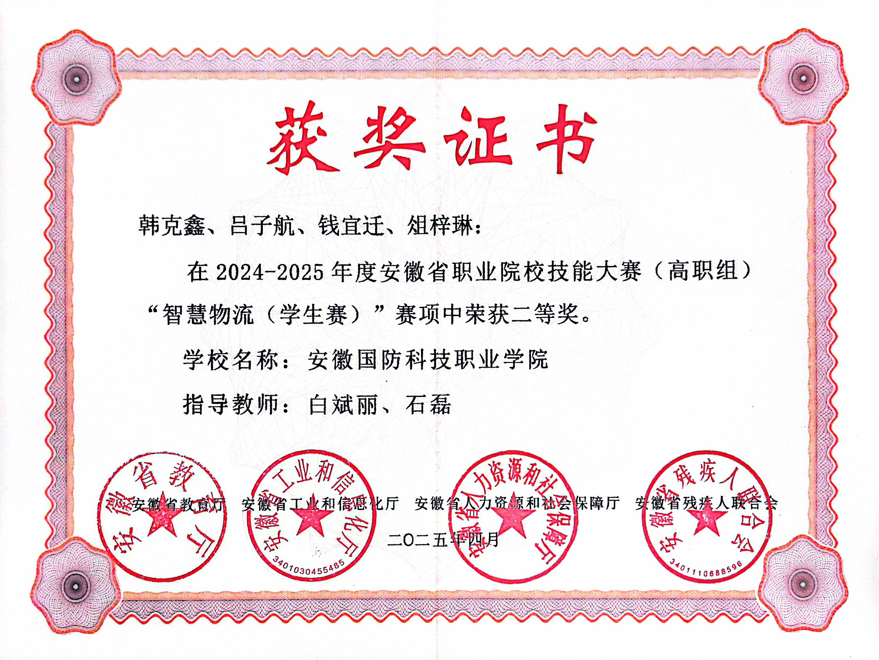 10 | 安徽省职业院校技能大赛(高职组)“智慧物流(学生赛)”赛项(2024) | 安徽省教育厅 | 二等奖 |