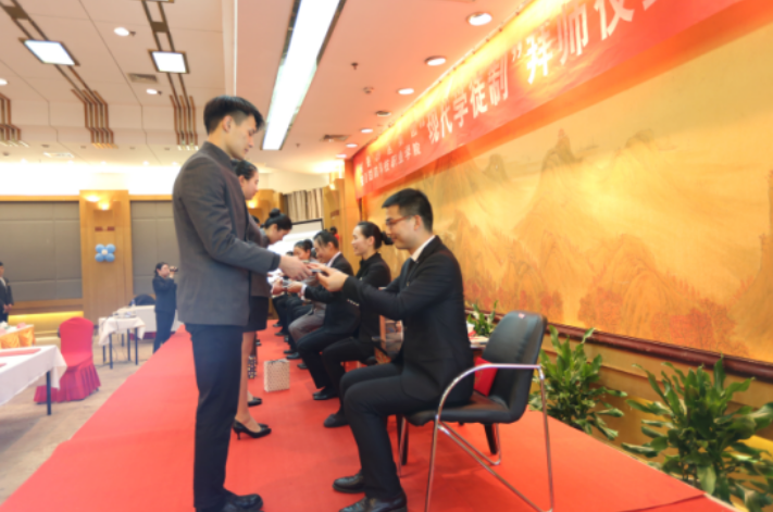 为弘扬尊师重道的优良传统,拜师仪式按照我国传统拜师礼仪进行。徒弟向师傅鞠躬、双手呈拜帖、敬茶,师傅回帖、师徒分别宣誓,互赠礼物。随后,师傅代表谈安全和徒弟代表樊倩倩先后发言。拜师礼成后,现场签订了师徒协议。该班学徒作为书香集团的准员工,将按书香集团的要求进行培养,毕业后进入书香集团旗下酒店工作。