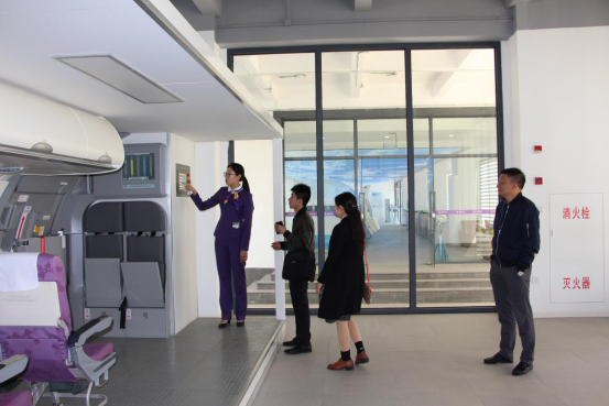 会后,陈世卿带领一行人参观了厦航学院的空乘实训中心,包括结合了空客和波音机型特点的现代化模拟舱、空客和波音的舱门训练实训室以及地面服务实训室。另外,陈世卿还带一行人参观了正在建设中的集多项功能于一体的演播实训室以及用于学生开展课余活动的综合实训室。