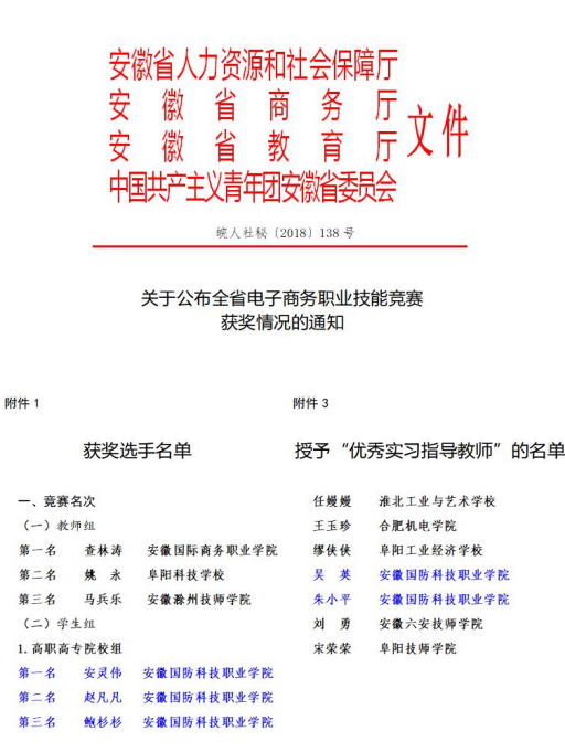 4月25日,安徽省人力资源和社会保障厅等部门联合发布了《关于公布全省电子商务职业技能竞赛获奖情况的通知》(皖人社秘〔2018〕138号),万象城官网学生安灵伟(指导教师:吴英)、赵凡凡(指导教师:朱小平)、鲍杉杉(指导教师:甘霖)在“2017全省电子商务职业技能竞赛”中发挥出色,分别获得第一、二、三名,包揽前三;同时,吴英、朱小平两位老师被授予“优秀实习指导教师”荣誉称号。