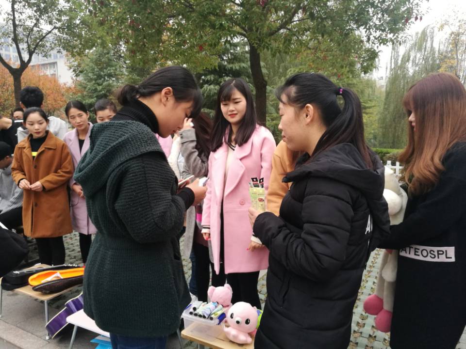 推销技巧课程又迎来新学期课程考核。选货、进货、手工制作、装扮商品、特色标语……15级电子商务班的同学们为这次特殊的考试足足忙活了两周,11月5日,“快乐拍拍街”活动在学院食堂门口顺利开市。