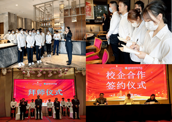 为弘扬尊师重道,深化校企合作,强化产教融合,5月16日至19日,学校分别与合肥洲际酒店、苏州书香酒店、合肥融创文旅城酒店群合作开展22级酒店管理与数字化运营专业现代学徒制拜师仪式系列活动。经贸管理学院院长杨力、酒店管理专业带头人司首婧,班主任李礼及22级酒店管理专业全体学生出席拜师仪式。