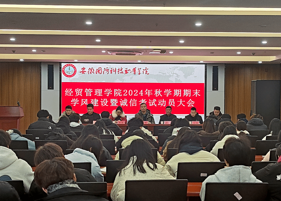 本网讯(经贸管理学院 陈玮)为切实强化学院学风建设,提高人才培养质量和学生的综合素质,12月27日中午,经贸管理学院在产教融合中心第一报告厅召开2024年秋学期期末学风建设暨诚信考试动员大会,学院党总支书记刘峰、党总支副书记韩纪平、学院辅导员及学生代表参加会议。会议由院团总支书记陈玮主持。