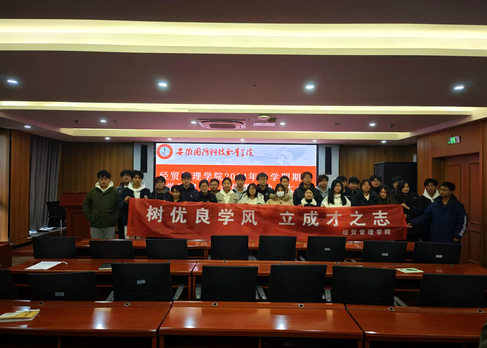 会上,相关辅导员宣讲了《经贸管理学院2024年秋学期期末学风建设专题活动实施方案》,对有关工作作出了具体安排。学生代表分别作出学风建设诚信考试承诺、学生干部“争先锋 当表率”作风建设倡议,全体学生代表在横幅上签名承诺。