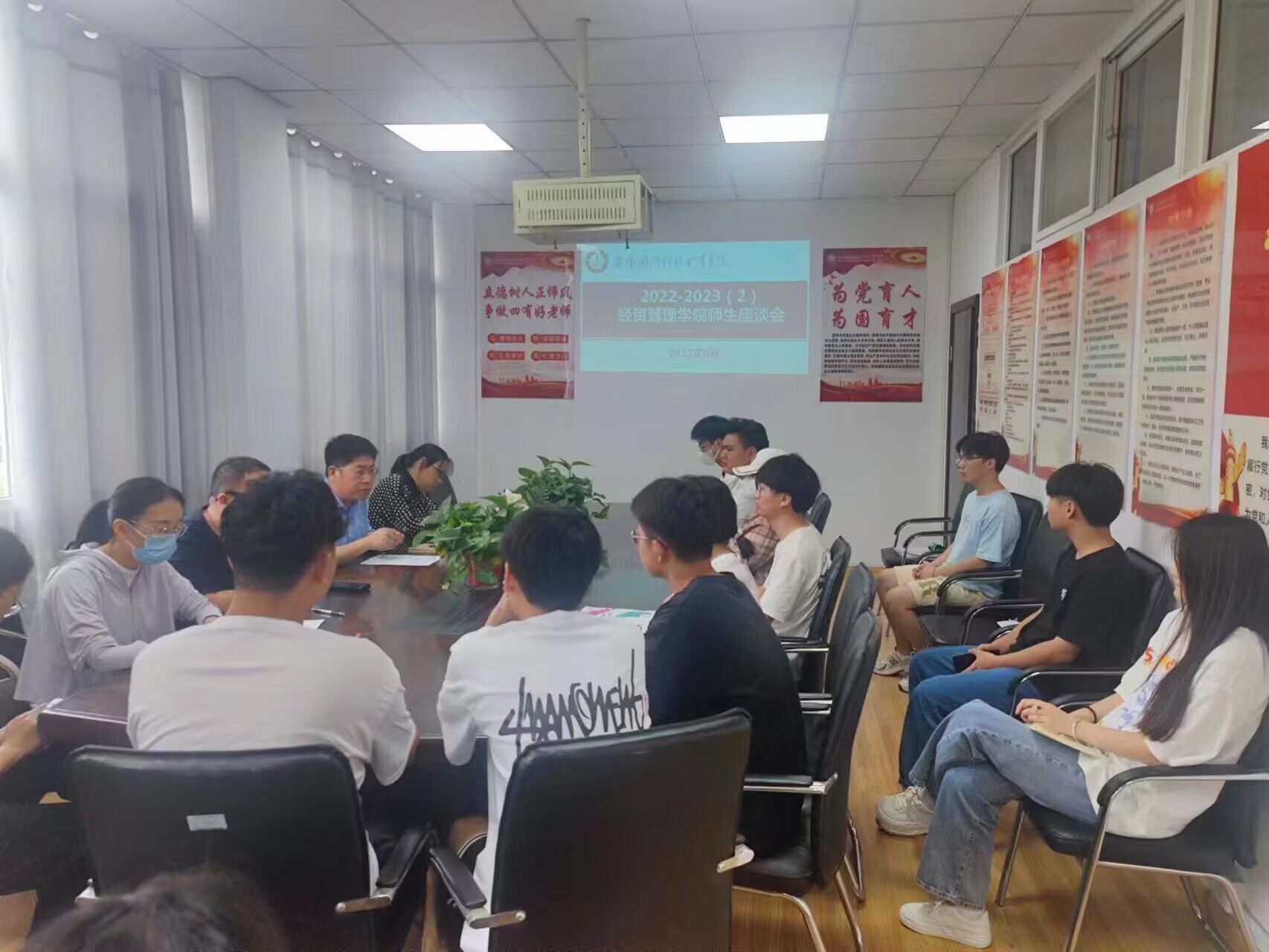 本网讯(经贸管理学院 光辰宸)为进一步加强师生之间的沟通交流,提升教育教学质量,规范教学过程化管理,经贸管理学院于6月8日下午在知行楼204和210会议室分别召开了2022-2023学年第二学期师生座谈会。座谈会由经贸管理学院党总支书记刘峰和院长杨力主持,教研室主任、专业带头人、部分专业教师以及21、22级学生代表参加了此次座谈会。